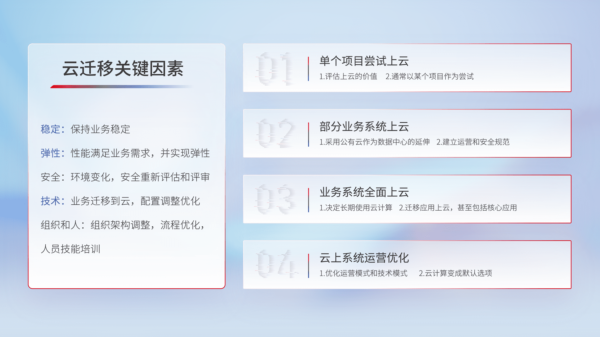 结合实际业务,,,从规划设计、、、云平台选型、、云原生改造、、、、数据迁移、、、集成交付,,,迁移全过程为客户识别最佳上云路径,,,做好风险识别管理,,,,设计网络架构、、身份权限、、安全审计合规、、、、操作审计、、、、日志审计、、、、监控告警策略、、、多站点容灾设计等,,,,对云上基础设施进行整体规划,,,提升IT治理水平,,以满足弹性、、高可用、、、、高性能的需求。。。