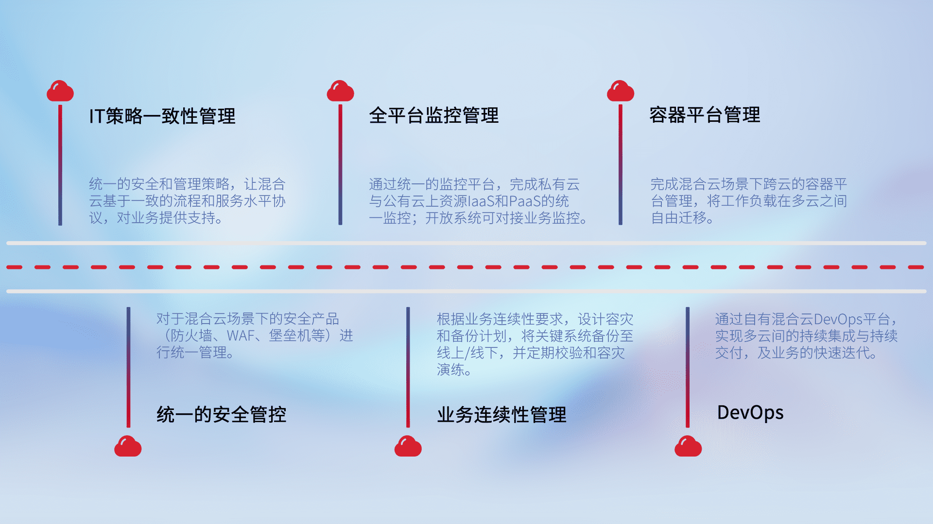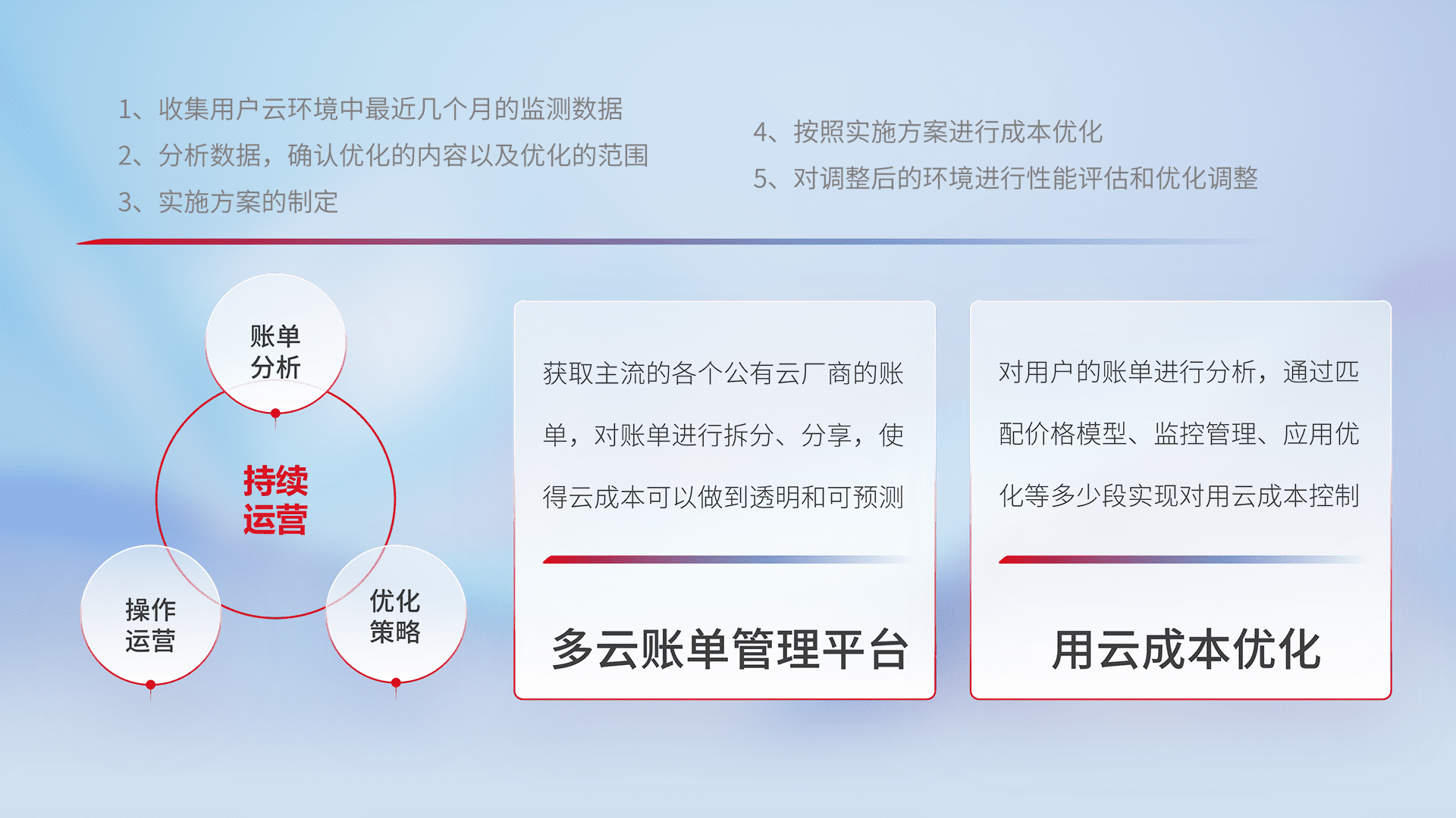 通过多云纳管,,以统一的资源数据模型把客户的云资源进行抽象和封装,,,,进而实现对多云资源的统一操作,,,保障云资源管理的可靠性、、、稳定性与可用性。。量身定制化运维内容,,配置、、、开发运维、、、补丁管理、、、备份、、、、监控、、认证和访问管理、、、审计和日常巡检等,,保障在用云过程中的可靠度,,,稳定度以及高可用率。。。。